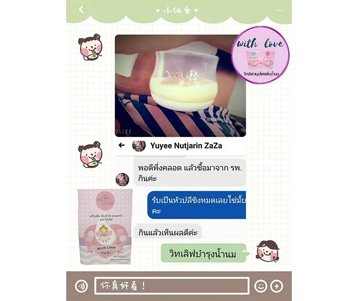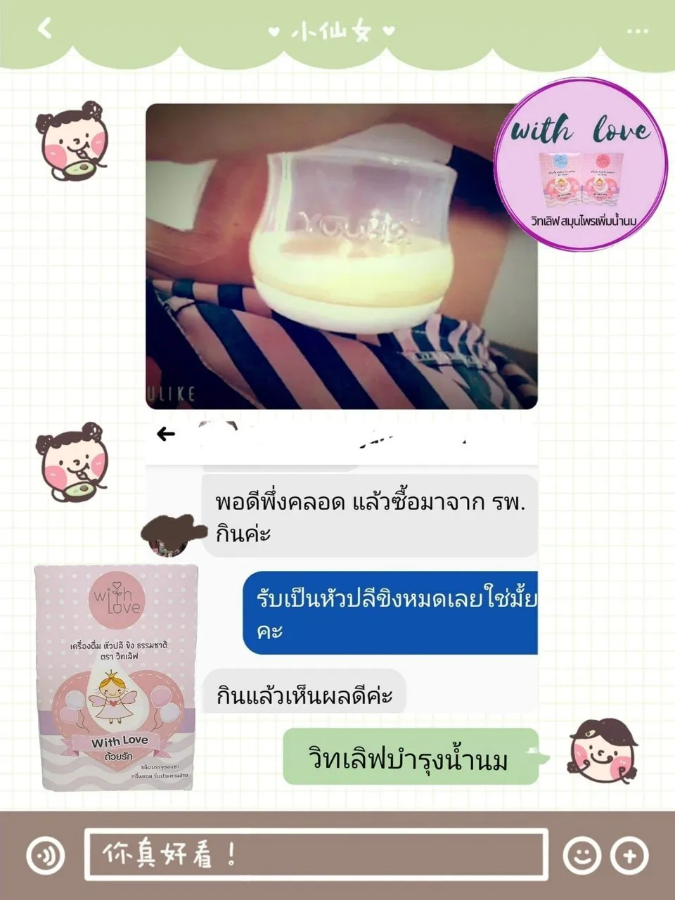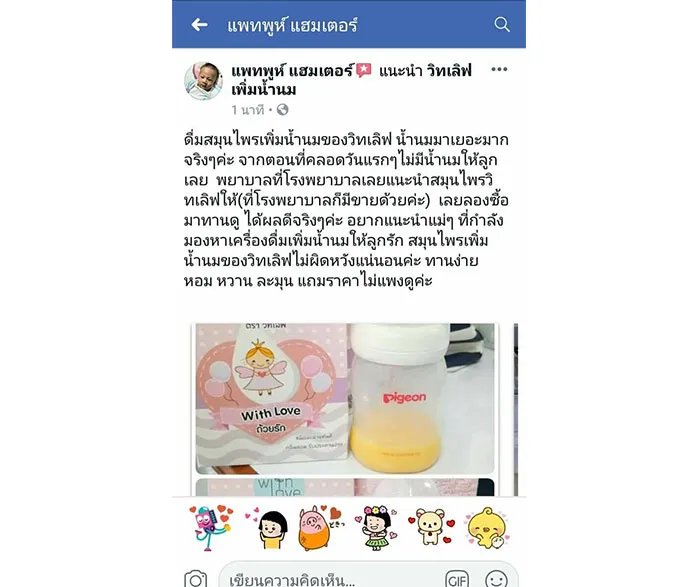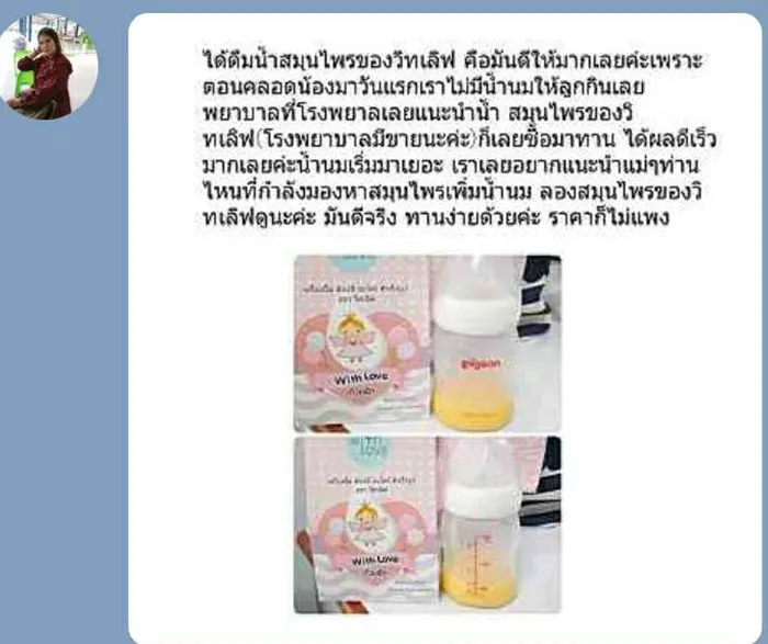 “ได้ดื่มน้ำสมุนไพรของวิทเลิฟ คือมันดีให้มากเลยค่ะเพราะตอนคลอดน้องมาวันแรกเราไม่มีน้ำนมให้ลูกกินเลยพยาบาลที่โรงพยาลเลยแนะนำน้ำ สมุนไพรของวิทเลิฟ(โรงพยาบาลมีขายนะค่ะ)ก็เลยซื้อมาทาน ได้ผลดีเร็วมากเลยค่ะน้ำนมเริ่มมาเยอะ เราเลยอยากแนะนำแม่ๆท่านไหนที่กำลังมองหาสมุนไพรเพิ่มน้ำนม ลองสมุนไพรของวิทเลิฟดูนะค่ะ มันดีจริง ทานง่ายด้วยค่ะ ราคาก็ไม่แพง”